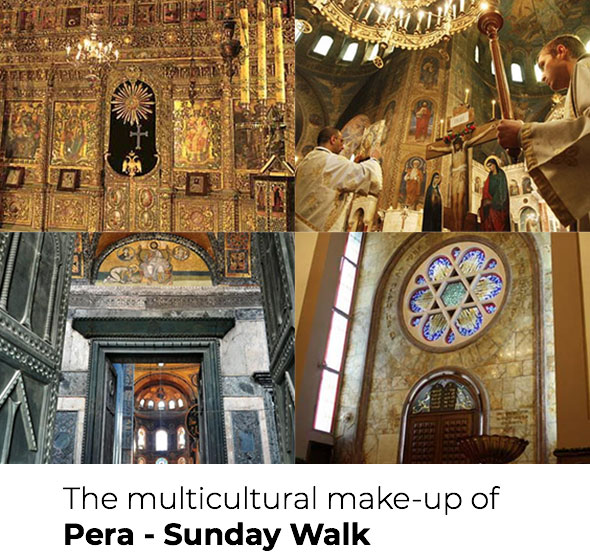 This special experience offers a chance to follow the footsteps and religious rituals of different communities inhabiting the old Istanbul district of Pera settlement history dates back to the 5th century AD. Venetian and Genoese: Pera was home to Catholic Venetian and Genoese immigrants referred as "Levant" meaning "Eastern" in French. The Levant culture left its mark in the architectural facade of this area. Many of the monuments and landmarks carry the traces of this culture. From Spain to Constantinople: Sephardic Jews were another society who played an important role in the development of culture and business of Pera area. Ottoman Turks of Istanbul: Needless to say, Turks have also been permanent residents of the city since 1453 and they added to the richness of the area through their Muslim traditions and culinary culture. Today, it is one of the very few places in Istanbul where the sound of Ezan (Muslim call to prayer) and the bells of Catholic Churches get mixed up in the air. Starting from an Armenian Gregorian Church you will visit one per each house of worship. |